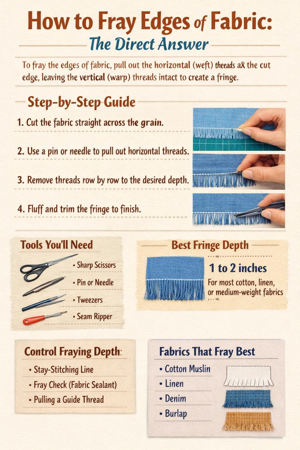 Para desfiar as bordas do tecido, puxe os fios horizontais (trama) ao longo da borda cortada do tecido, deixando os fios verticais (urdidura) intactos e soltos. Isso cria a característica franja ou aparência desgastada. O método mais confiável é fazer um corte reto e, em seguida, usar um alfinete ou agulha para soltar e puxar os fios um por um da borda, trabalhando fileira por fileira até atingir a profundidade desejada da franja. Para a maioria dos tecidos de peso médio, como algodão ou linho, puxando os fios a uma profundidade de 1 a 2 polegadas cria uma franja completa e atraente sem comprometer a integridade estrutural da peça.