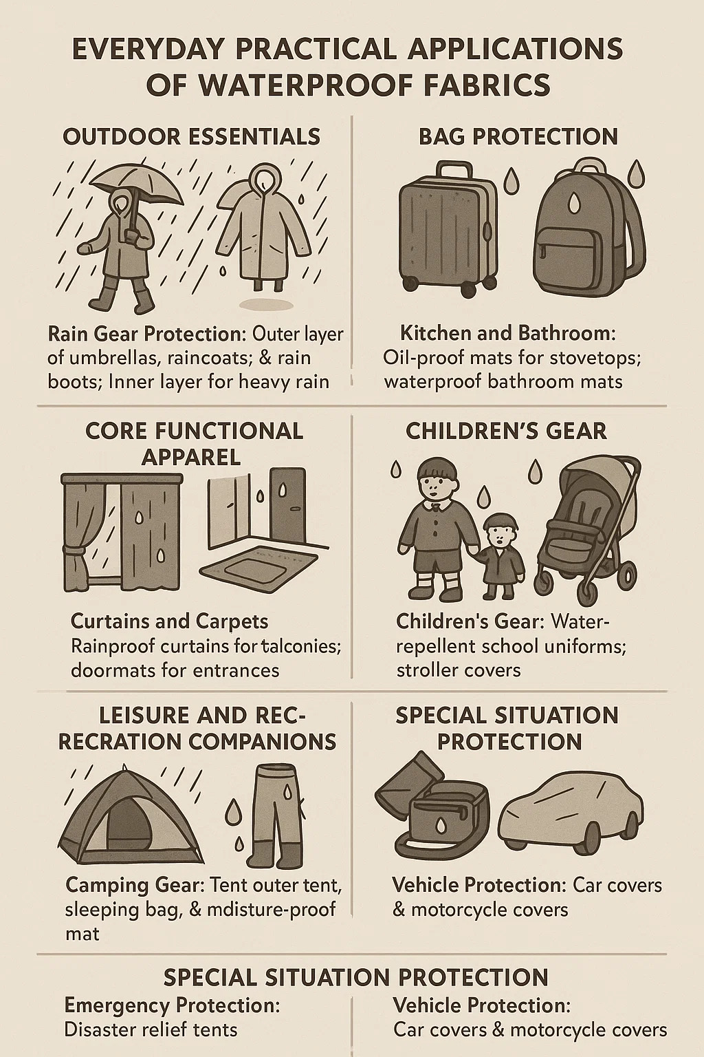 Equipamentos Infantis: Uniformes escolares hidrorrepelentes; capas para carrinhos; proteja as crianças da chuva repentina e mantenha-as aquecidas.