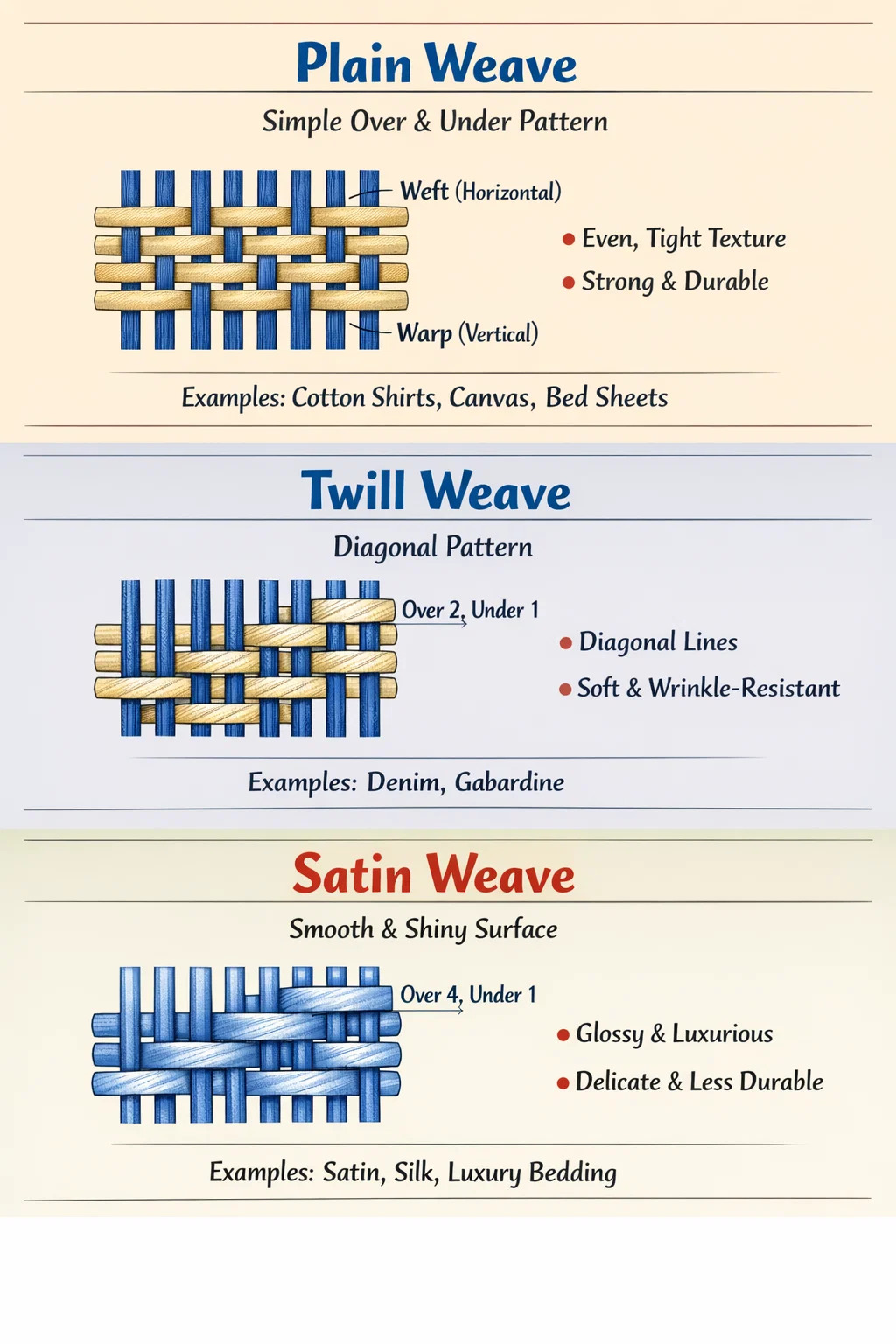 Na indústria têxtil, quase todos tecidos são derivados de três técnicas básicas de tecelagem. Esses três métodos de tecelagem determinam a aparência, durabilidade e toque do tecido.