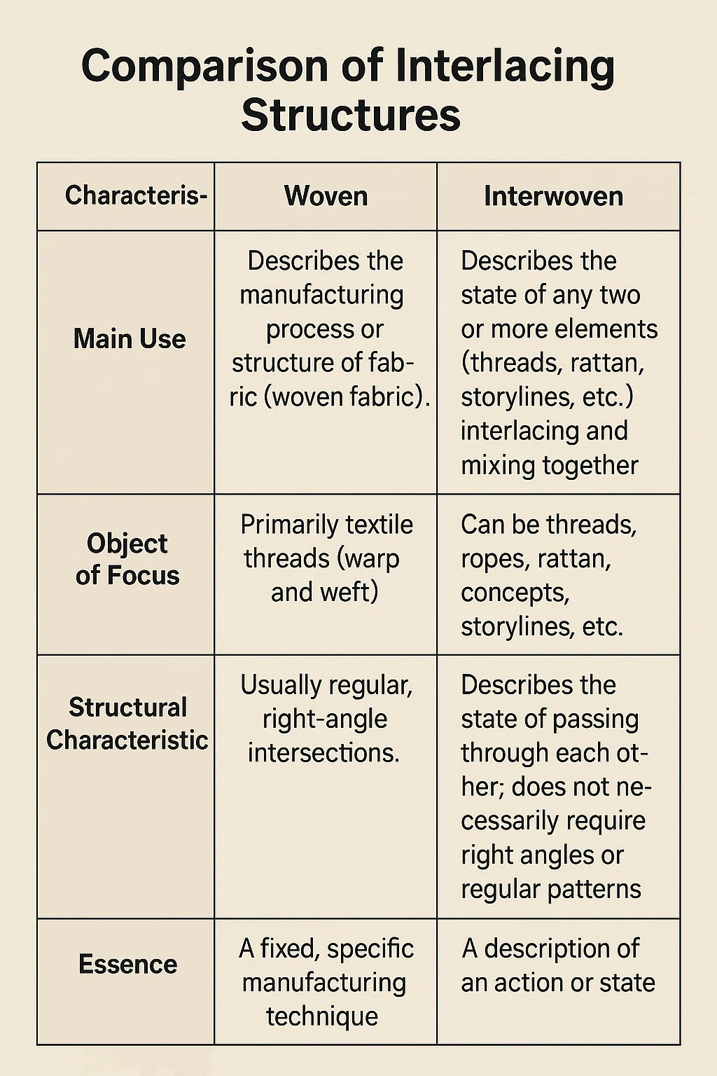 | Uso primário | Descreve o processo de fabricação específico ou estrutura acabada de têxteis (tecido tecido). | Descreve o estado em que dois ou mais conjuntos de elementos (fios, juncos, histórias, etc.) são entrecruzados ou misturados. |