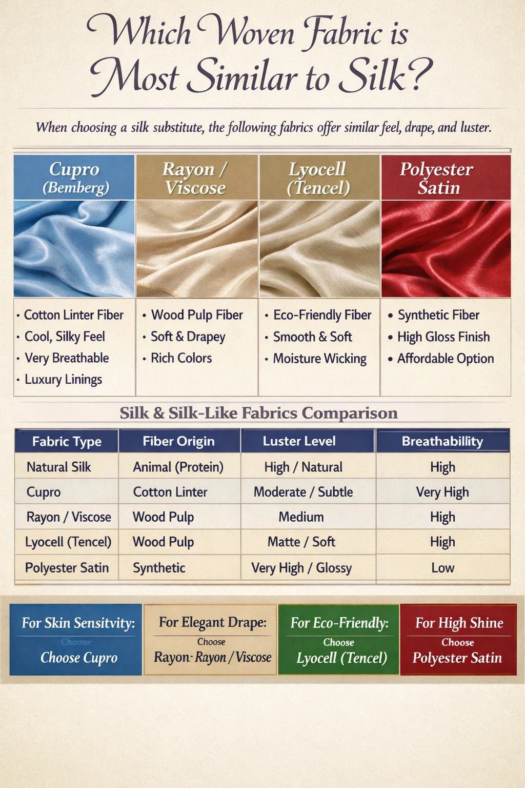 Ao procurar por um tecido que reproduz a sensação luxuosa, o brilho e o caimento da seda natural, os concorrentes mais proeminentes são Rayon, Cupro e Liocel (Tencel) . Entre estes, Cupro é amplamente considerado o jogo mais próximo em termos de respirabilidade e toque sedoso, enquanto Poliéster em tecido acetinado serve como a alternativa sintética acessível mais comum. Esses tecidos utilizam tecendo técnicas para imitar as fibras proteicas lisas produzidas pelos bichos-da-seda.